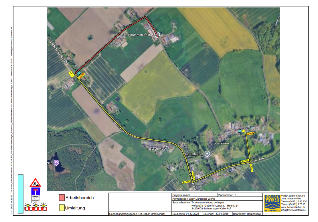 Es werden Trinkwasserleitungen verlegt. Aufgrund dieser Maßnahmen wird es zu einer Vollsperrung dieses Bereichs kommen. Die Umleitung erfolgt über die Gettorfer Landstraße und die Kaltenhofer Allee.